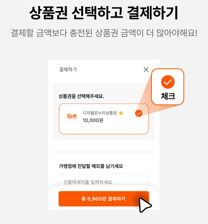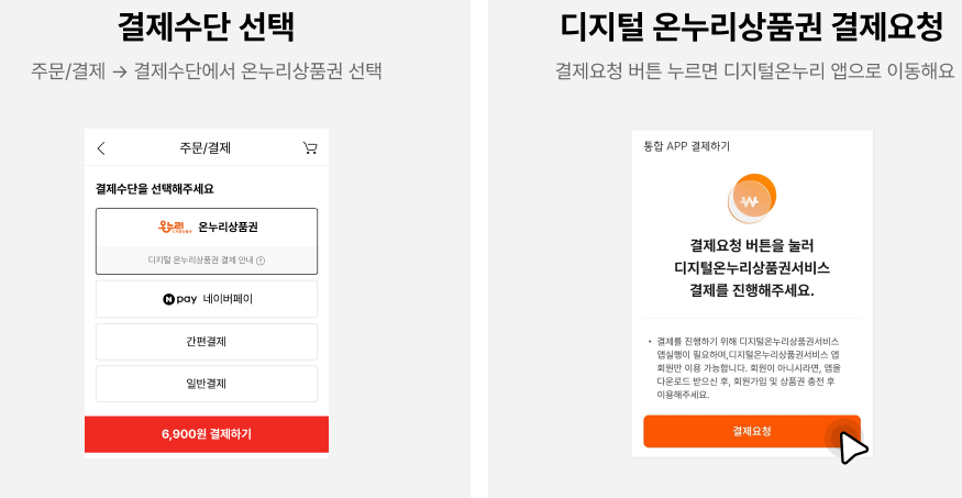 주문 할 때 온누리 상품권을 선택하면 온누리상품권 앱과 연결되고, 순서에 맞게 사용하시면 됩니다.