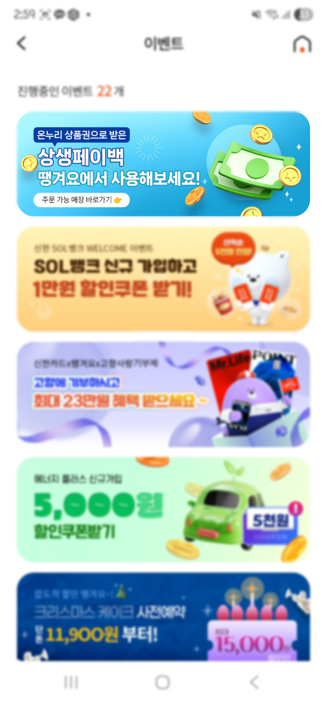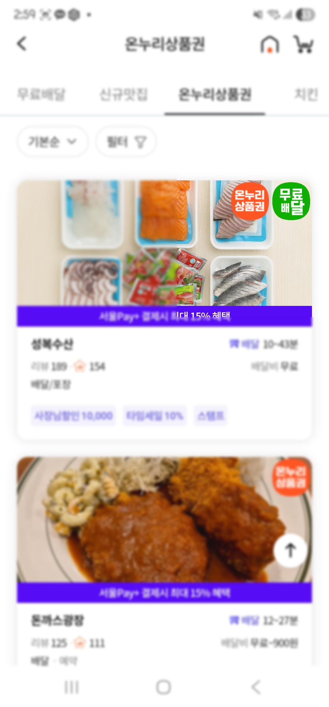 이벤트 목록에서 온누리 상품권으로 받은 상생페이백 관련 버튼을 누르면 현재 설정한 지역에서 온누리 상품권으로 주문할 수 있는매장을 볼 수 있습니다.