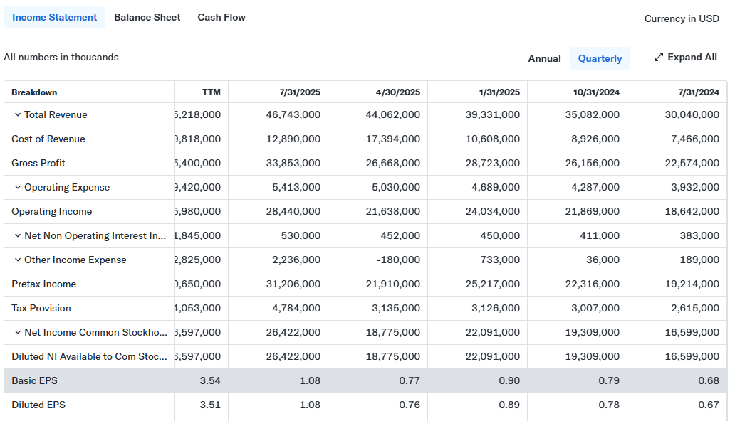 4. Income Statement 탭에서 Quarterly 선택 후 EPS 확인