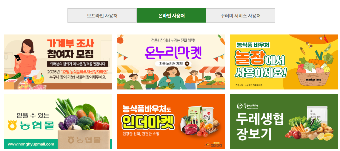온라인 사용은 농식품 바우처 홈페이지 가입 후에 사용 가능합니다.